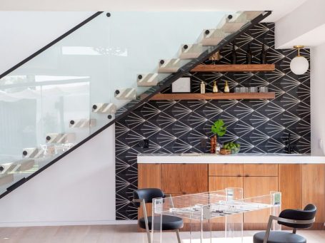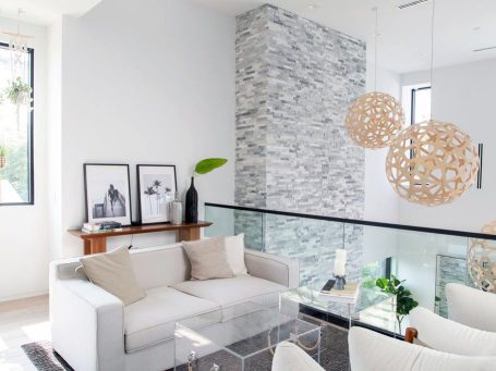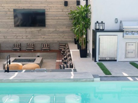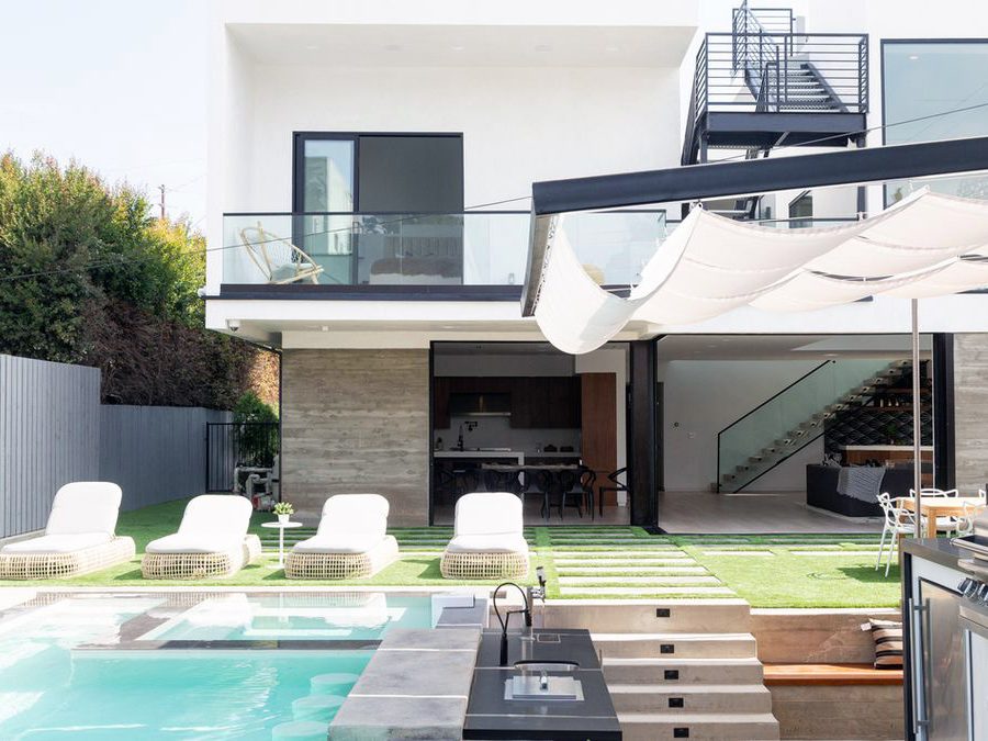 This 3,600 sq. ft., modern, 2-story home is designed for indoor-outdoor living. A formal entry opens into a spacious living area with high ceilings, towering stone fireplace, and massive retractable doors that open to the backyard. Ideal for entertaining, the backyard is equipped with an outdoor BBQ/kitchen, IPE wood seating, fire pit, screening area, as well as, a saline pool with swim up bar and Jacuzzi. The light filled second floor has 3 bedrooms, a fully equipped media room and a master suite with a soaking tub. An outdoor stair leads to a rooftop deck with 360-degree views of the city and beyond.